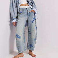 ジーンズ女性用プリントロングパンツカジュアルルーズデニムブルーママハートミッドウエストワイド脚パンツパンツポケットボタンY2kスプライス